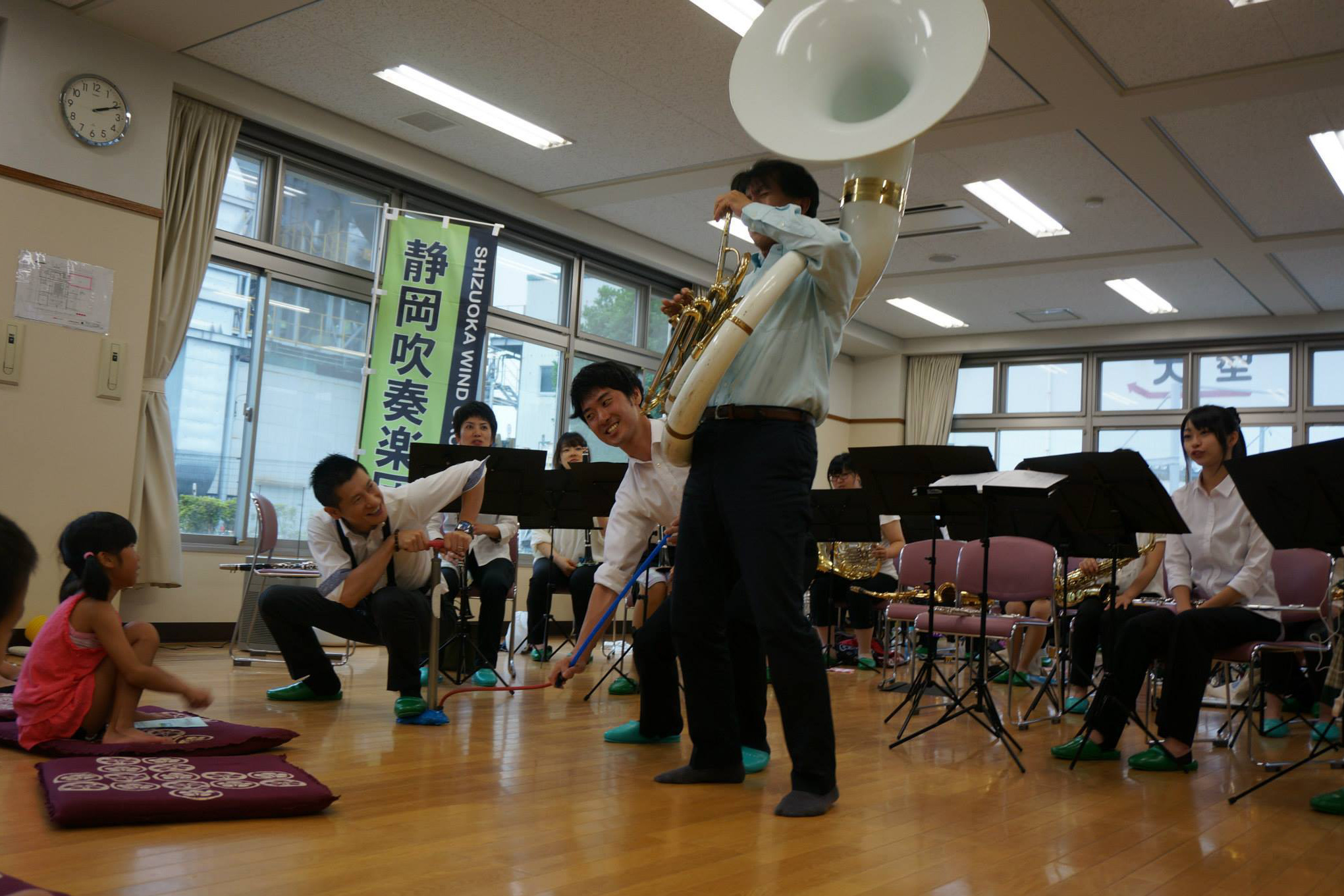 台風が近づき、あいにくの天候となってしまいましたが、スーザフォンのパフォーマンスや、楽器体験コーナーでは、子ども達は目を輝かせて大喜び!