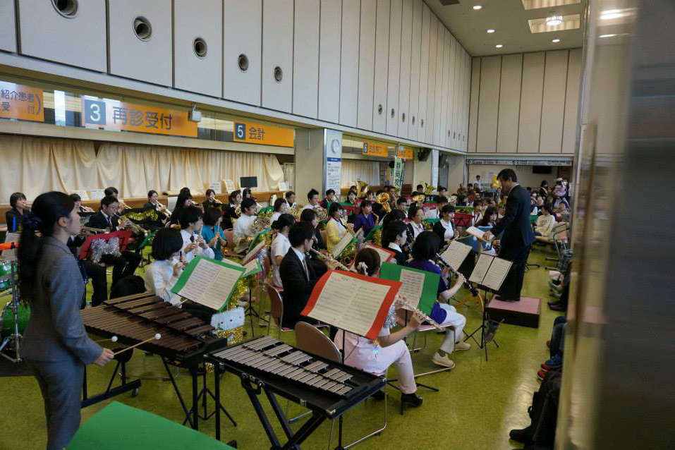 「アナと雪の女王メドレー」や「軍師官兵衛メインテーマ」など、おなじみの曲を楽器の演奏経験がある病院職員のみなさんと一緒に演奏し、患者さんや病院を訪れた人達に楽しんでいただきました。